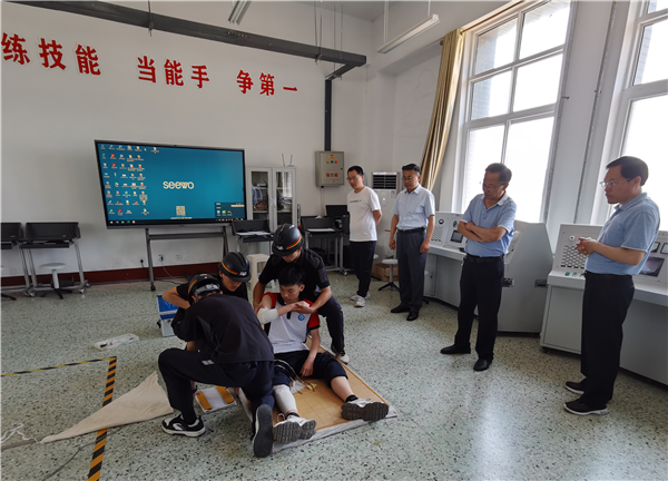 杜兆喜一行现场观看了“遇险人员救治”子模块技能演练,详细了解同学们备赛的计划与时间安排,询问当前同学们的训练需求和思想状况,并叮嘱备赛师生在比赛中要注重细节,调适心态,集中精神,希望同学们能够进一步加大练习力度,提升技能水平。