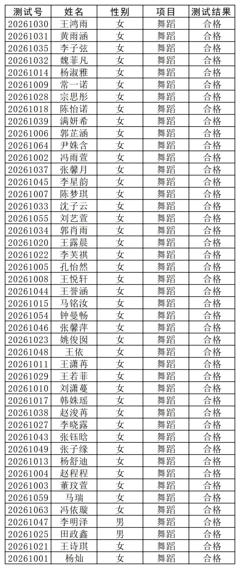 2026年艺体专业生招生考试合格学生公示